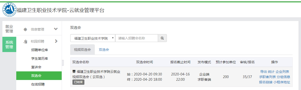 為做好疫情影響下的2020屆畢業(yè)生的就業(yè)服務(wù)工作,落實服務(wù)不斷線,就業(yè)不停歇的工作要求,4月20日,福建衛(wèi)生職業(yè)技術(shù)學(xué)院2020屆畢業(yè)生云就業(yè)視頻專場雙選招聘會順利舉辦,全力保障畢業(yè)生求職的需求。