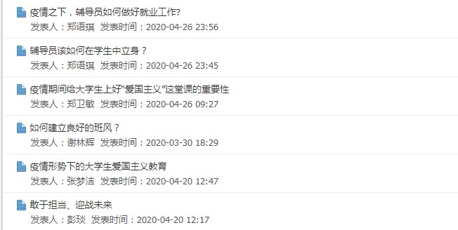 學(xué)習(xí)過(guò)程中,輔導(dǎo)員們還圍繞“如何做好疫情期間青年學(xué)生的愛(ài)國(guó)主義教育”“如何建立良好的班風(fēng)”“疫情期間如何繼續(xù)提升大學(xué)生職業(yè)競(jìng)爭(zhēng)力”等主題積極開(kāi)展網(wǎng)絡(luò)集中研討,學(xué)習(xí)交流同分享,攜手同行共成長(zhǎng)。