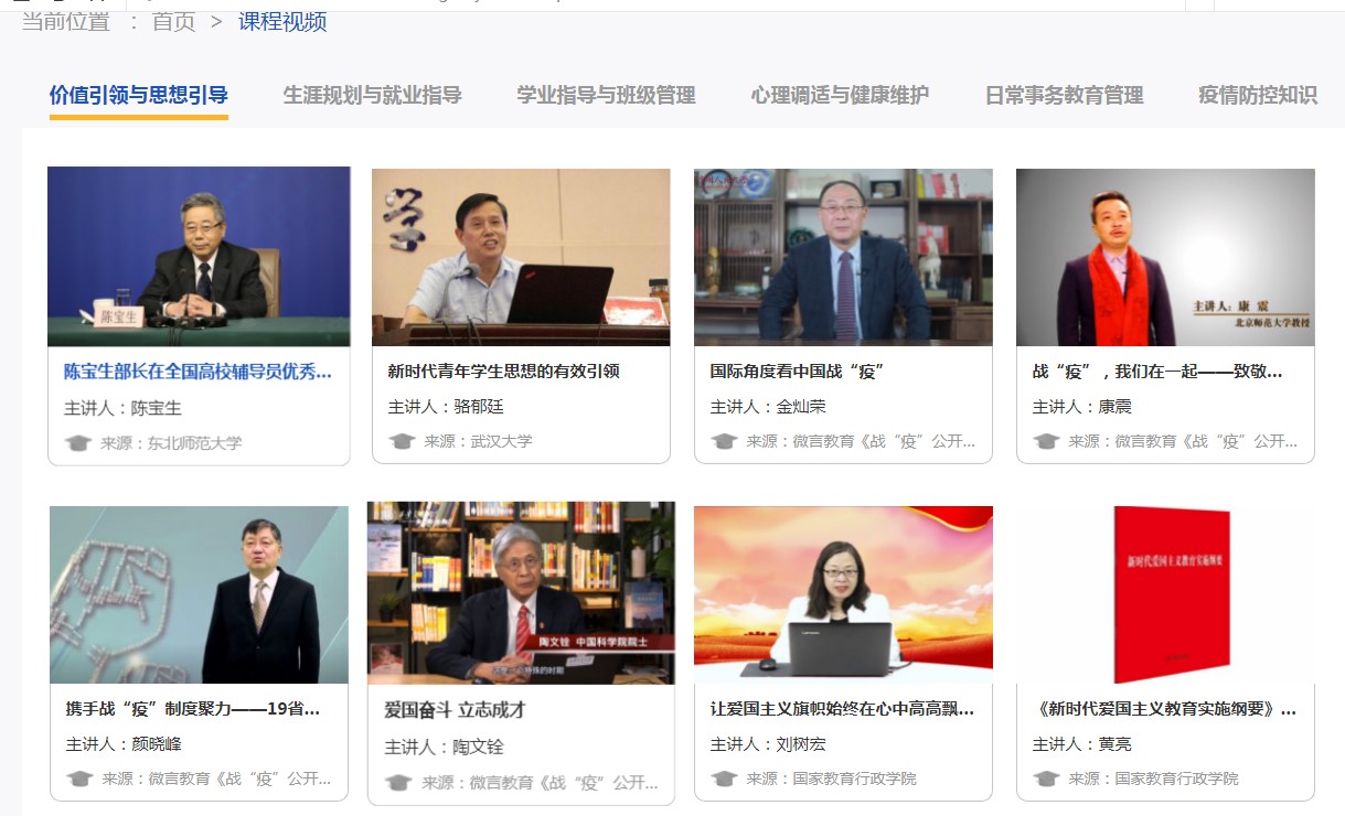 本次培訓(xùn)活動(dòng)分為課程學(xué)習(xí)、主題研討、心得撰寫(xiě)、直播答疑等四個(gè)環(huán)節(jié),課程涵蓋“價(jià)值引領(lǐng)與思想引導(dǎo)”“生涯規(guī)劃與就業(yè)指導(dǎo)”“學(xué)業(yè)指導(dǎo)與班級(jí)管理”“日常事務(wù)教育管理”“心理調(diào)適與健康維護(hù)”“疫情防控知識(shí)”六大模塊,課程體系全。