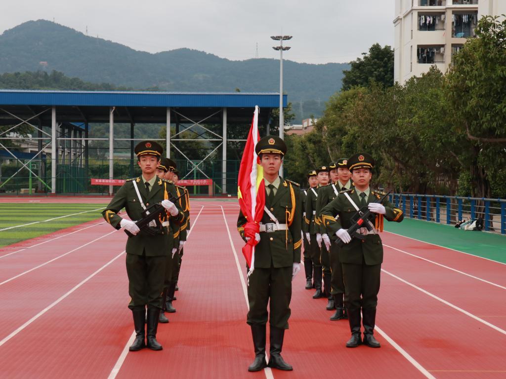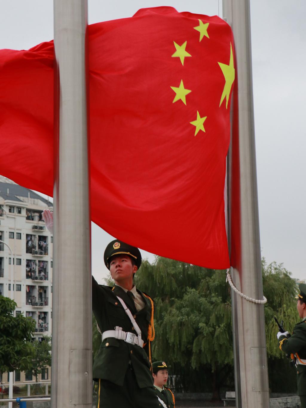 隨著國旗護(hù)衛(wèi)隊(duì)矯健有力的步伐,雄壯的國歌聲響起,典禮正式拉開序幕。向著秋雨洗禮過后的清空,五星紅旗冉冉升起,全體師生向國旗敬禮。