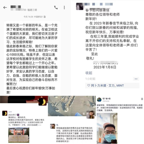 慰問結(jié)束后,同學(xué)們紛紛發(fā)來感謝短信,感激國家資助政策的支持,感謝學(xué)校和老師的溫暖關(guān)懷,表示未來將再接再厲、踔厲奮發(fā)、學(xué)有所成,報答學(xué)校和老師的殷切栽培,并向老師們送上了新春祝福。