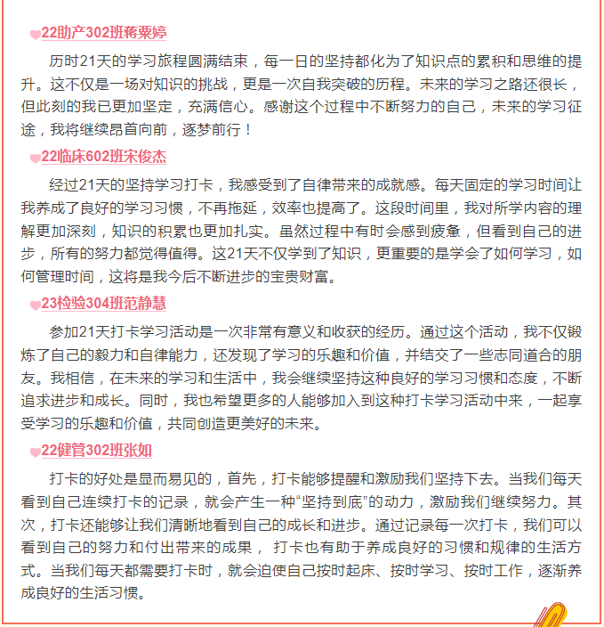 頒獎(jiǎng)儀式上,學(xué)生工作部副部長(zhǎng)張麗萍宣讀本次活動(dòng)獲獎(jiǎng)學(xué)生名單。獲獎(jiǎng)學(xué)生代表22康復(fù)302班黃曉玲分享學(xué)習(xí)打卡活動(dòng)心得,她表示,21天的學(xué)習(xí)打卡活動(dòng)讓她收獲了堅(jiān)持做一件事情的成就感,收獲了知識(shí),也收獲了充實(shí)的每一天。