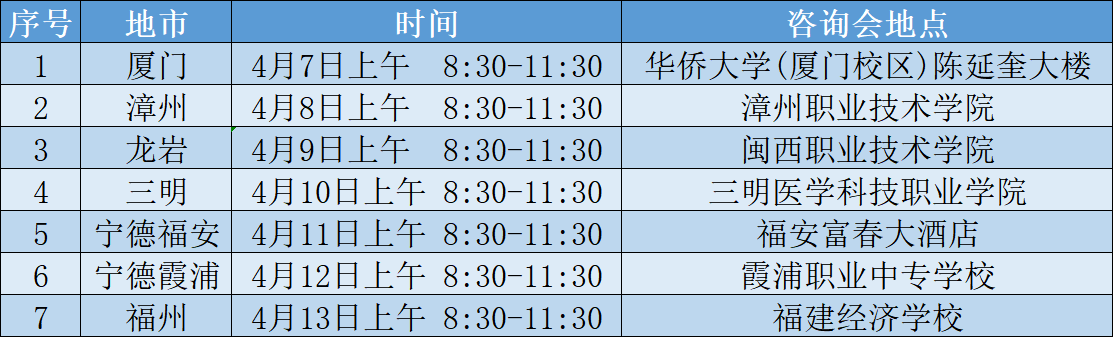 2025年福建省高職分類志愿填報即將到來,為幫助大家更全面地了解福建衛(wèi)生職業(yè)技術(shù)學(xué)院的招生政策、專業(yè)特色及報考指南,學(xué)校將在廈門、漳州、龍巖、三明、寧德、福州等地,開展線下招生咨詢會!