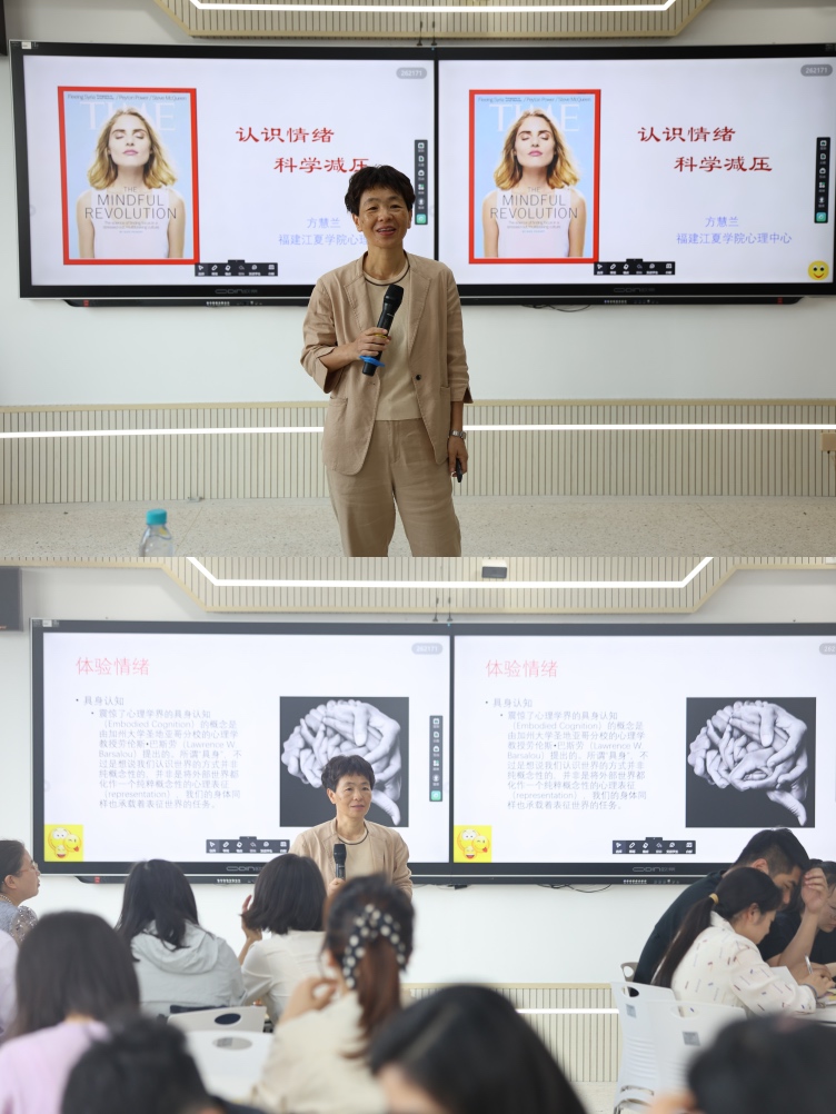 為助力輔導(dǎo)員提升情緒管理能力,以更積極健康的狀態(tài)投入育人工作,4月29日,我校特邀福建江夏學(xué)院社會(huì)心理研究所負(fù)責(zé)人方慧蘭副教授為全體輔導(dǎo)員開(kāi)展“認(rèn)識(shí)情緒,科學(xué)減壓”專(zhuān)題培訓(xùn)。