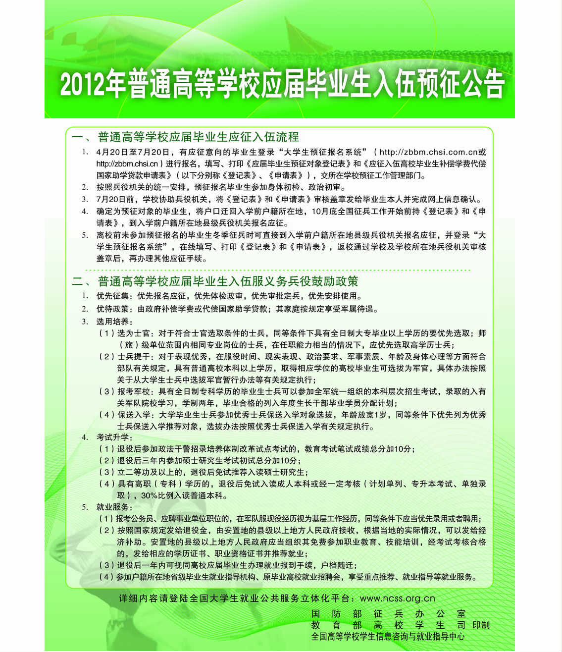 2012年普通高等學校應屆畢業(yè)生入伍預征公告