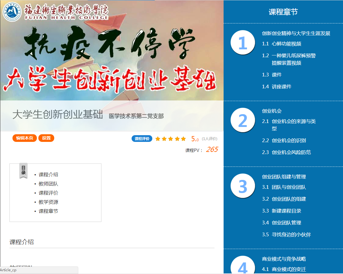 醫(yī)學(xué)技術(shù)系第二黨支部在超星學(xué)習(xí)通平臺開設(shè)《大學(xué)生創(chuàng)新創(chuàng)業(yè)基礎(chǔ)》在線課程,共上線16學(xué)時(shí)課程,內(nèi)容涵蓋創(chuàng)新創(chuàng)業(yè)精神、創(chuàng)業(yè)機(jī)會、創(chuàng)業(yè)團(tuán)隊(duì)組建于管理、商業(yè)模式與競爭戰(zhàn)略、新產(chǎn)品營銷、互聯(lián)網(wǎng)+創(chuàng)業(yè)、初創(chuàng)項(xiàng)目的財(cái)務(wù)資源規(guī)劃、創(chuàng)業(yè)計(jì)劃書的書寫技巧,有助于引導(dǎo)學(xué)生增加創(chuàng)新創(chuàng)業(yè)基礎(chǔ)知識儲備。共有33位同學(xué)作為參賽梯隊(duì)隊(duì)員,參與了首批次的網(wǎng)絡(luò)學(xué)習(xí)。