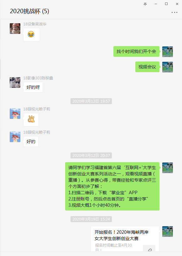 3月27日晚,在前期電話、QQ、微信溝通指導(dǎo)的基礎(chǔ)上,終于有一個(gè)項(xiàng)目趨于成熟,并成功召開第一次項(xiàng)目小組會議。項(xiàng)目小組的負(fù)責(zé)人是第二黨支部入黨積極分子18設(shè)備302林詩穎同學(xué),參與的同學(xué)有19影像302溫梓杰、19影像302陳鴻怡、19設(shè)備301朱舒婷、19設(shè)備302沈愛玲、19影像304李唯一。