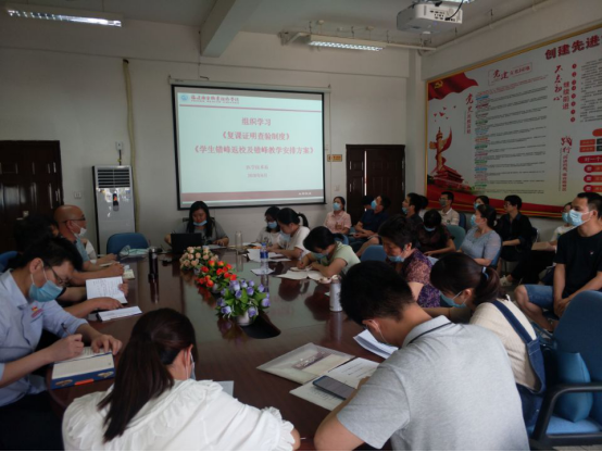 時值6月,新冠肺炎的疫情防控還是不容忽視,而在校生的返學(xué)問題也迫在眉睫。為了加強教師對學(xué)生錯峰返校教學(xué)安排的了解和保障廣大師生的身體健康,2020年6月4日,醫(yī)學(xué)技術(shù)系組織全體教師共同認真學(xué)習(xí)了“兩案八制”中的《復(fù)課證明查驗制度》和《學(xué)生錯峰返校及錯峰教學(xué)安排方案》兩個文件。