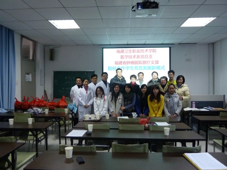 2012年1月6日下午三點,在醫(yī)學(xué)技術(shù)系黨總支洪聿榮副書記、立項負責(zé)人郭禮堅副主任的帶領(lǐng)下一行五人至福建省腫瘤醫(yī)院,與醫(yī)院的放療科黨支部共同舉行了黨支部立項“建立院校合作機制下學(xué)生黨員發(fā)展新模式”的項目啟動儀式。省腫瘤醫(yī)院黨辦葉阿琴主任也在百忙之中出席了本次活動。