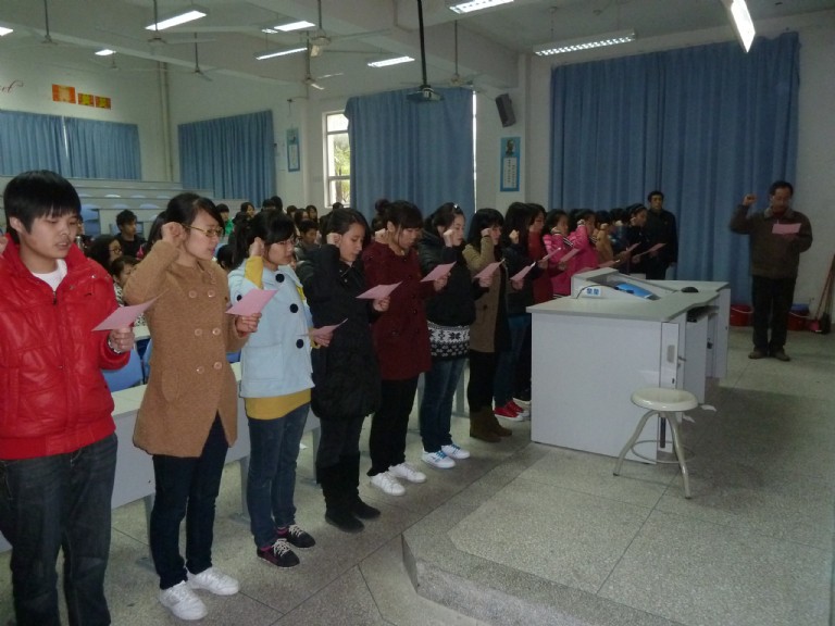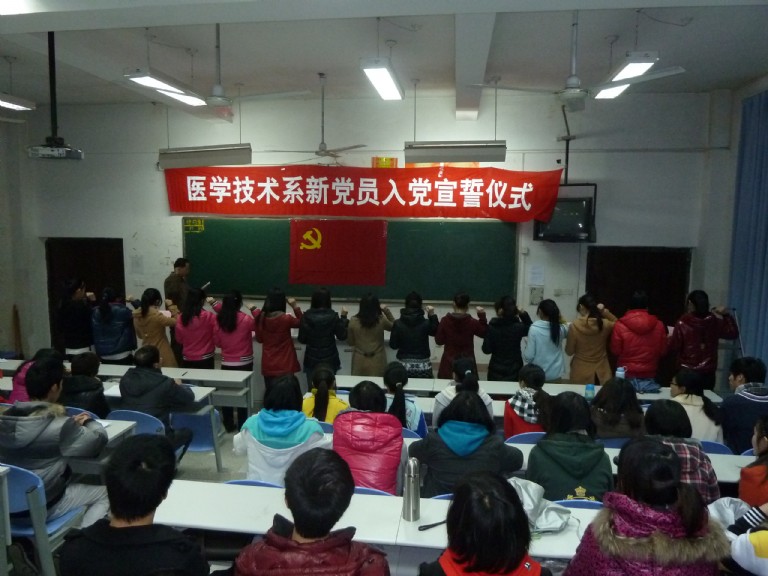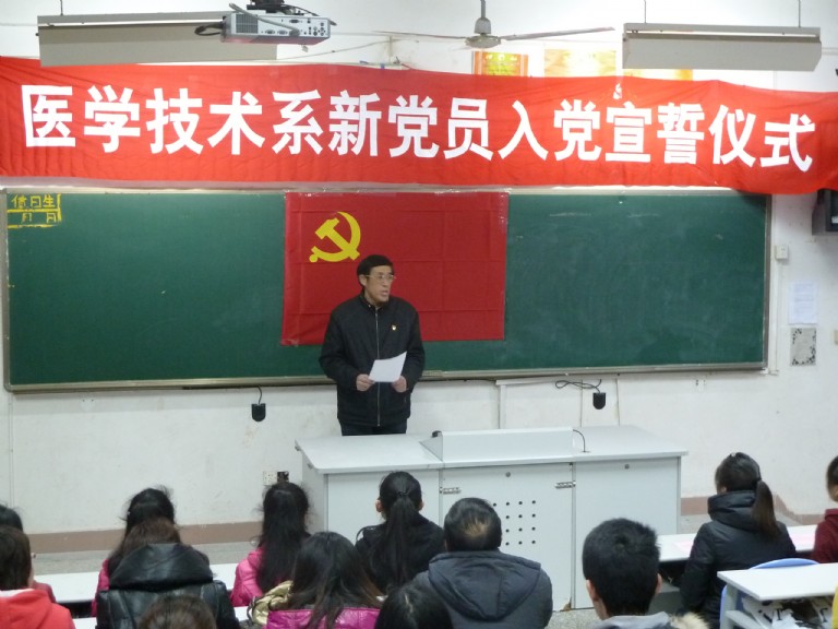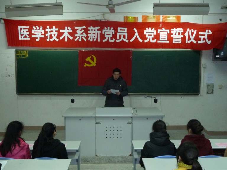 “我志愿加入中國(guó)共產(chǎn)黨,擁護(hù)黨的綱領(lǐng),遵守黨的章程,履行黨員義務(wù)……”2012年3月13日下午,醫(yī)學(xué)技術(shù)系15名新發(fā)展黨員在系部第一階梯教室面對(duì)鮮艷的黨旗莊嚴(yán)宣誓。出席本次宣誓儀式的有系黨總支委員、各支部委員、輔導(dǎo)員、預(yù)備黨員,以及入黨積極分子。宣誓儀式由系黨總支副書記洪聿榮同志主持。 伴隨著雄壯的《國(guó)際歌》,宣誓儀式拉開了帷幕。首先由系黨總支組織委員林雪金老師代表黨總支宣布參加宣誓的15名黨員名單。隨后,15名預(yù)備黨員在黨總支宣傳委員連健老師的帶領(lǐng)下,面對(duì)鮮紅的黨旗莊嚴(yán)宣誓。10檢驗(yàn)301班巫金梅同學(xué)、10放療301班戴藝濤同學(xué)分別代表參加宣誓的新黨員和入黨積極分子發(fā)言。 儀式上,系黨總支委員郭禮堅(jiān)副主任在會(huì)上首先代表系黨總支向新黨員同志表示衷心的祝賀。并指出,預(yù)備黨員面向黨旗進(jìn)行入黨宣誓,表現(xiàn)了入黨的莊重性和嚴(yán)肅性,是對(duì)預(yù)備黨員進(jìn)行教育、增強(qiáng)黨性觀念的一種形式。宣誓是一種形式,更重要的是通過這種形式,用誓詞激勵(lì)黨員,終生牢記自己的入黨誓詞,并付諸實(shí)踐行動(dòng)。最后,他向全體新黨員和入黨積極分子提出了4點(diǎn)要求:1、政治追求的起點(diǎn)要高。2、要把體現(xiàn)自身先進(jìn)性的目標(biāo)與自己的本職工作學(xué)習(xí)緊密地結(jié)合起來。3、加強(qiáng)理論學(xué)習(xí)。4、樹立自身良好威信。 入黨宣誓儀式在熱烈、隆重、莊嚴(yán)的氣氛中進(jìn)行,感染了每一位與會(huì)同志,同時(shí)也是一堂很好的黨課教育課,更是為醫(yī)學(xué)技術(shù)系黨總支開展“創(chuàng)先爭(zhēng)優(yōu)”活動(dòng)寫下了亮麗的一筆。