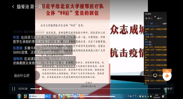 何旭春和過丹丹老師結(jié)合習近平總書記3月15日給北京大學援鄂醫(yī)療隊全體“90后”黨員回信,引導(dǎo)學生展開討論,要以先進醫(yī)務(wù)工作者為榜樣,努力積攢本領(lǐng),茁壯成長。青春之美,正是奮斗之美;青年之快樂,正是奉獻之快樂。