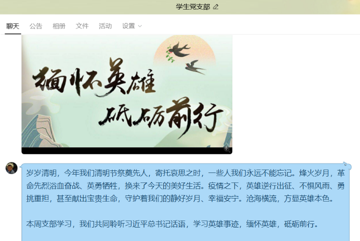 學生黨支部組織支部黨員共同聆聽習近平總書記話語,學習防疫期間涌現(xiàn)的英雄事跡,緬懷英雄,砥礪前行。黨員們認為當疫情形勢持續(xù)向好,當武漢終于迎來“重啟”,熬過這段艱難時光的我們,更要記住這些為國為民付出生命的人。支部黨員結(jié)合給全系34個班級的主題班會課,指導(dǎo)學生開展“網(wǎng)上祭英烈,防疫思英雄”系列活動。