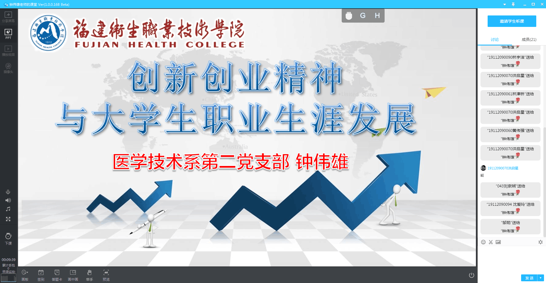 訓練營第三招:群直播,空中微課心連心。3月26日晚,借助騰訊課堂直播平臺,鐘偉雄老師給19級創(chuàng)新創(chuàng)業(yè)小組的同學們帶來一場題為《創(chuàng)新創(chuàng)業(yè)精神與大學生職業(yè)生涯發(fā)展》的直播培訓講座。同學的創(chuàng)新創(chuàng)業(yè)熱情被點燃。