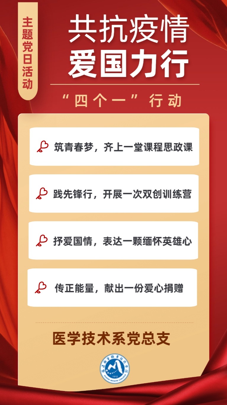 為深入學習貫徹習近平總書記重要指示精神,堅決貫徹黨中央關(guān)于新冠肺炎疫情防控各項決策部署,進一步激發(fā)醫(yī)學技術(shù)系黨員教師的家國情懷與責任擔當,醫(yī)學技術(shù)系各黨支部合力進行“四個一行動”,在3月份開展以“共抗疫情,愛國力行”為主題的黨日活動。