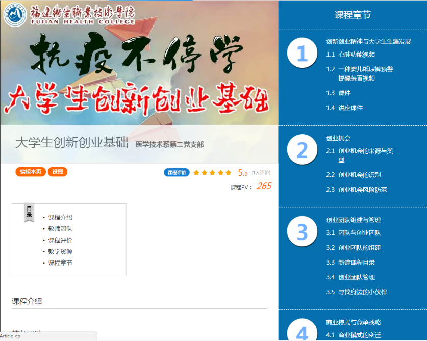 訓練營第二招:建網(wǎng)課,雙創(chuàng)知識學起來。醫(yī)學技術(shù)系第二黨支部在超星學習通平臺開設(shè)《大學生創(chuàng)新創(chuàng)業(yè)基礎(chǔ)》在線課程,共上線16學時課程,內(nèi)容涵蓋創(chuàng)新創(chuàng)業(yè)精神、創(chuàng)業(yè)機會、創(chuàng)業(yè)團隊組建于管理、創(chuàng)業(yè)計劃書的書寫技巧等,有助于引導(dǎo)學生增加創(chuàng)新創(chuàng)業(yè)基礎(chǔ)知識儲備。共有33位同學作為參賽梯隊隊員,參與了首批次的網(wǎng)絡(luò)學習。