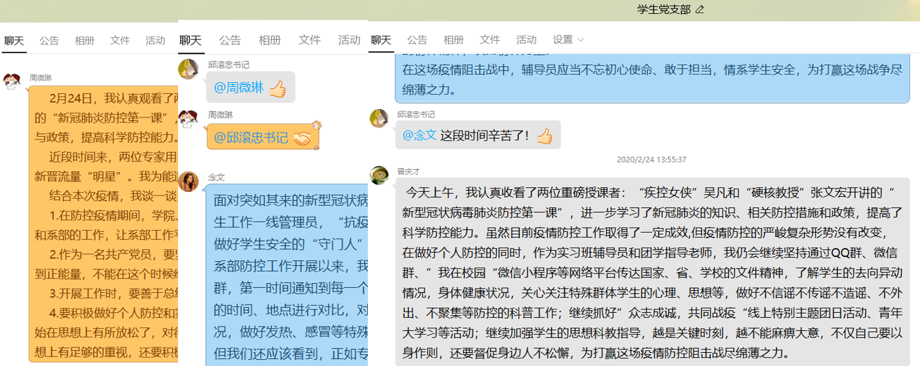 學(xué)生黨支部黨員陳念文表示,作為輔導(dǎo)員,“抗疫”時刻雖不能成為“最美逆行者”,但可以用自己扎實細(xì)致地工作成為學(xué)生安全的“守門人”!理清學(xué)生管理和服務(wù)工作的要求和重點,每日做好學(xué)生聯(lián)防聯(lián)控工作,跟進(jìn)好特殊學(xué)生的動態(tài)跟蹤和家校聯(lián)系工作。
