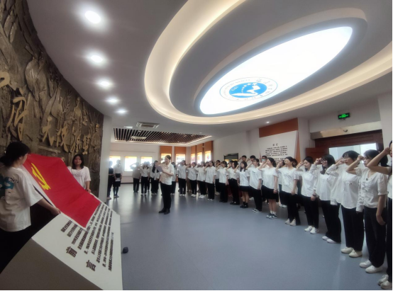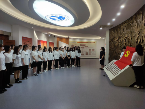 在學生第二黨支部書記蔣程序同志帶領下,敖昌群等預備黨員面向黨旗,舉起右手,莊嚴宣誓,用鏗鏘有力的聲音許下新時代共產(chǎn)黨人鄭重的承諾。擲地有聲的誓言響徹校史館,印證百年閩衛(wèi)院人的使命擔當。