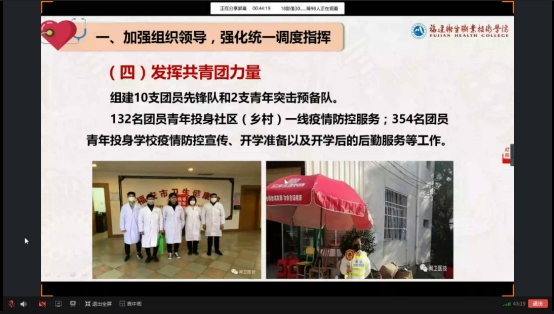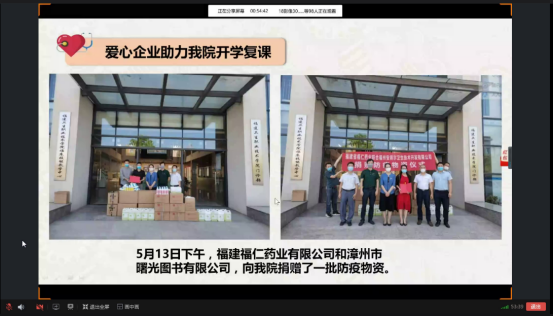 黃銘珊副院長還介紹了學(xué)院認真貫徹疫情防控工作要求,打響疫情防控的主動戰(zhàn)的各項工作情況。她特別和同學(xué)們分享交流了馳援武漢奮戰(zhàn)一線的優(yōu)秀校友事跡、校友企業(yè)捐贈防疫物資、黨員師生防疫行動情況,以及我們學(xué)校青年學(xué)子主動投身社區(qū)(鄉(xiāng)村)一線防疫服務(wù)的情況。