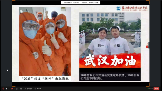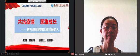 首先,黃銘珊副院長為同學(xué)們深入介紹了國內(nèi)外疫情的發(fā)展情況。她重點闡述了在黨中央的統(tǒng)一領(lǐng)導(dǎo)與精準施策下,全國人民眾志成城,我國疫情防控取得了階段性勝利。她還結(jié)合抗疫一線的典型案例,深入講述了在這場疫情防控阻擊戰(zhàn)中,全國各地的醫(yī)務(wù)工作者們、“兩山”醫(yī)院建設(shè)的工人們及其他各行各業(yè)奮斗們在抗疫一線的典型事跡。