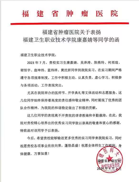 近日,我院收到福建省腫瘤醫(yī)院和阿美龍科技有限責(zé)任公司對實(shí)習(xí)生的表揚(yáng)信,信中對2021級康嘉靖、吳澤濤、謝恒宇、翁坤煒、藍(lán)煒祥、黃沈妍、許譯航等七名同學(xué)在實(shí)習(xí)過程中嚴(yán)格遵守各項(xiàng)規(guī)章制度,勤奮工作、虛心好學(xué)、任勞任怨,積極參與各項(xiàng)活動(dòng),工作表現(xiàn)突出。