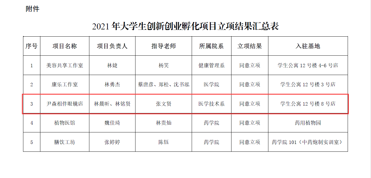 為充分發(fā)揮我校創(chuàng)新創(chuàng)業(yè)教育優(yōu)勢,提升人才培養(yǎng)質(zhì)量,鼓勵有志于自主創(chuàng)業(yè)并符合條件的大學生進行創(chuàng)業(yè)實踐,打造學生創(chuàng)新創(chuàng)業(yè)實踐平臺,學校于2021年開展創(chuàng)新創(chuàng)業(yè)項目申報工作,經(jīng)院(系)申報,校外專家評審、公示,學院審核,我系《尹森相伴眼鏡店》同意立項。