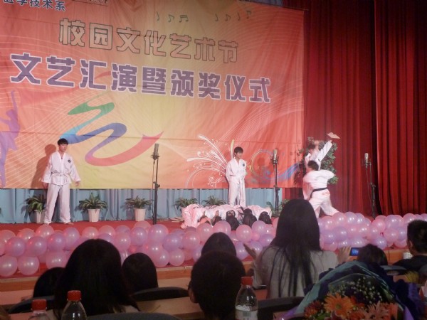 隨后,一場(chǎng)青春洋溢的健美操正式拉開(kāi)文藝匯演序幕。11營(yíng)養(yǎng)301班帶來(lái)的小品令全場(chǎng)捧腹大笑,12影像301及12放療301班同學(xué)們曼妙的舞姿,動(dòng)感的音樂(lè)伴奏贏得了臺(tái)下觀眾的陣陣喝彩。相聲、小品、跆拳道表演及詩(shī)朗誦等節(jié)目也不甘示弱,將晚會(huì)推向一個(gè)又一個(gè)高潮。一段代表醫(yī)學(xué)技術(shù)系全體師生感謝洪聿榮書(shū)記六年辛勤付出的VCR將晚會(huì)的氣氛推向最高峰。最后,晚會(huì)在全體演員的大合唱中落下帷幕。