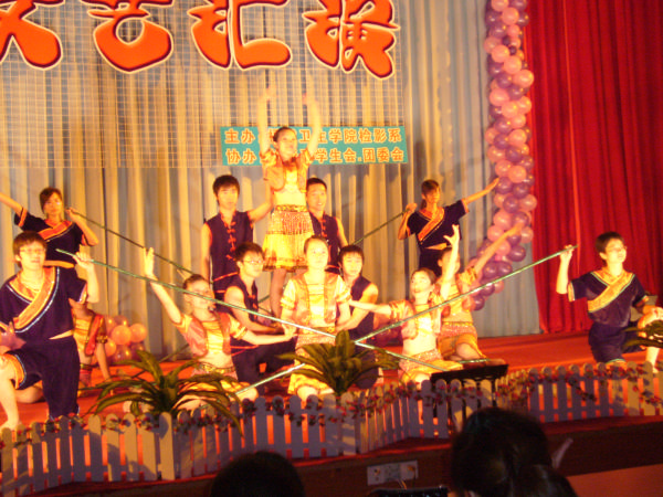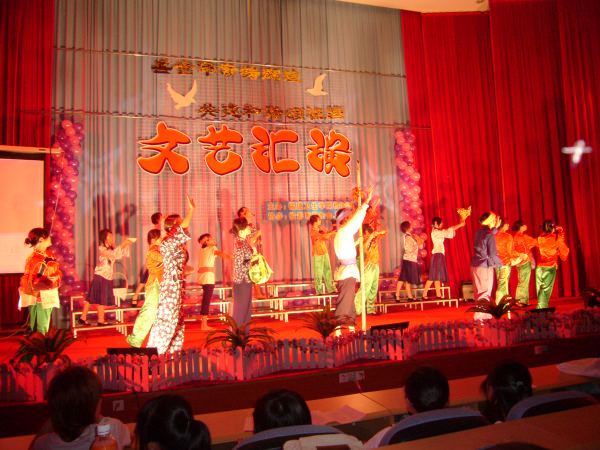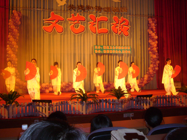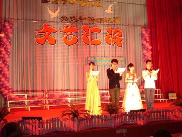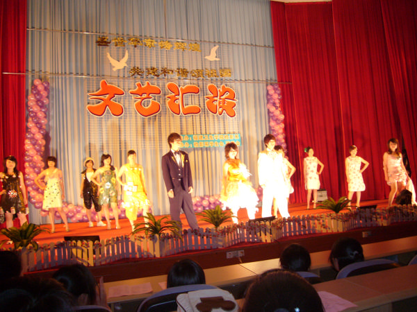 晚上6:30, 一曲《十送紅軍》正式拉開文藝晚會的序幕。今年是建國60周年,六十年風雨兼程鑄就強盛的中國,六十載勵精圖治共創(chuàng)世紀的輝煌,《十送紅軍》情真意切,唱出了軍民魚水情。整臺晚會節(jié)目新穎多樣、內(nèi)容積極向上,學術廳里無不洋溢著歡樂的氣氛。有剛勁有力的功夫扇《中國功夫》,舞姿翩翩的扇子舞《青花瓷》、樸素灑脫的苗族竹竿舞和火暴的勁舞《No Body》。相聲《庸醫(yī)》、小品《我像誰》、《梁祝》不時引起場下陣陣笑聲。歌曲串燒《歌舞青春》、男女合唱《流星下的愿》、獨唱《他不愛我》、歌伴舞《說唱臉譜》也為晚會增色不少。傳統(tǒng)中國茶藝表演《茶韻》、環(huán)保時裝走秀《Over the rainbow》、氣勢磅礴的詩朗誦《這片山河,這個時代》將氣氛一次又一次地推向高潮。最后,晚會在健美操《Trance Mix》中落下了帷幕。