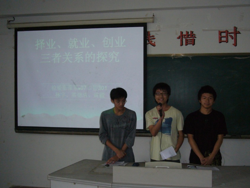檢驗影像系于4月22日下午在系部第二階梯教室舉行題為“擇業(yè) 就業(yè) 創(chuàng)業(yè)”的學(xué)生專題研討會。出席本次研討會的有檢驗影像系書記洪聿榮老師、公共基礎(chǔ)部書記蘭寶金老師、公共基礎(chǔ)部劉光磊、柯瓊鶯、丁愛芝、張東方、柏美平老師以及各班輔導(dǎo)員,研討會由07影像301班的吳麗紗主持。