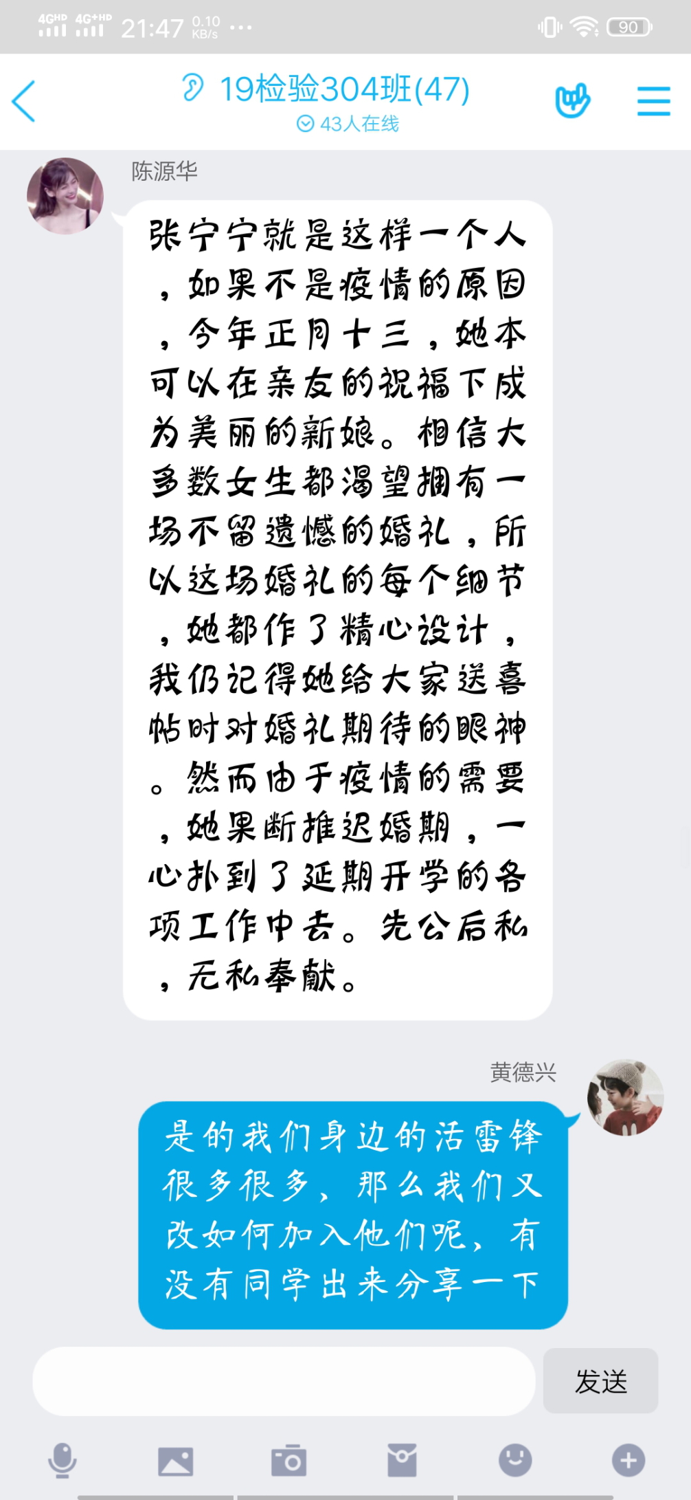 各班團(tuán)支書組織團(tuán)員觀看雷鋒的生平事跡,雷鋒語錄,朗誦贊揚(yáng)雷鋒的詩(shī)歌。同學(xué)們?cè)趯W(xué)習(xí)的過程中加深和鞏固了心中對(duì)雷鋒的認(rèn)知;疫情當(dāng)前,每個(gè)同學(xué)都認(rèn)真看待,積極應(yīng)對(duì),并表達(dá)對(duì)一線醫(yī)務(wù)人員的關(guān)心和祝福。同學(xué)們表示,每個(gè)人嚴(yán)以律己,我們終將勝利。此次抗擊疫情中,不少同學(xué)主動(dòng)請(qǐng)纓參與志愿者工作,體現(xiàn)了一名大學(xué)生和青年志愿者的情懷。學(xué)習(xí)雷鋒精神讓同學(xué)們知道了如何實(shí)現(xiàn)自身價(jià)值,為打贏疫情防控阻擊戰(zhàn)貢獻(xiàn)自己的力量,發(fā)揮青年力量,擔(dān)起時(shí)代重任。