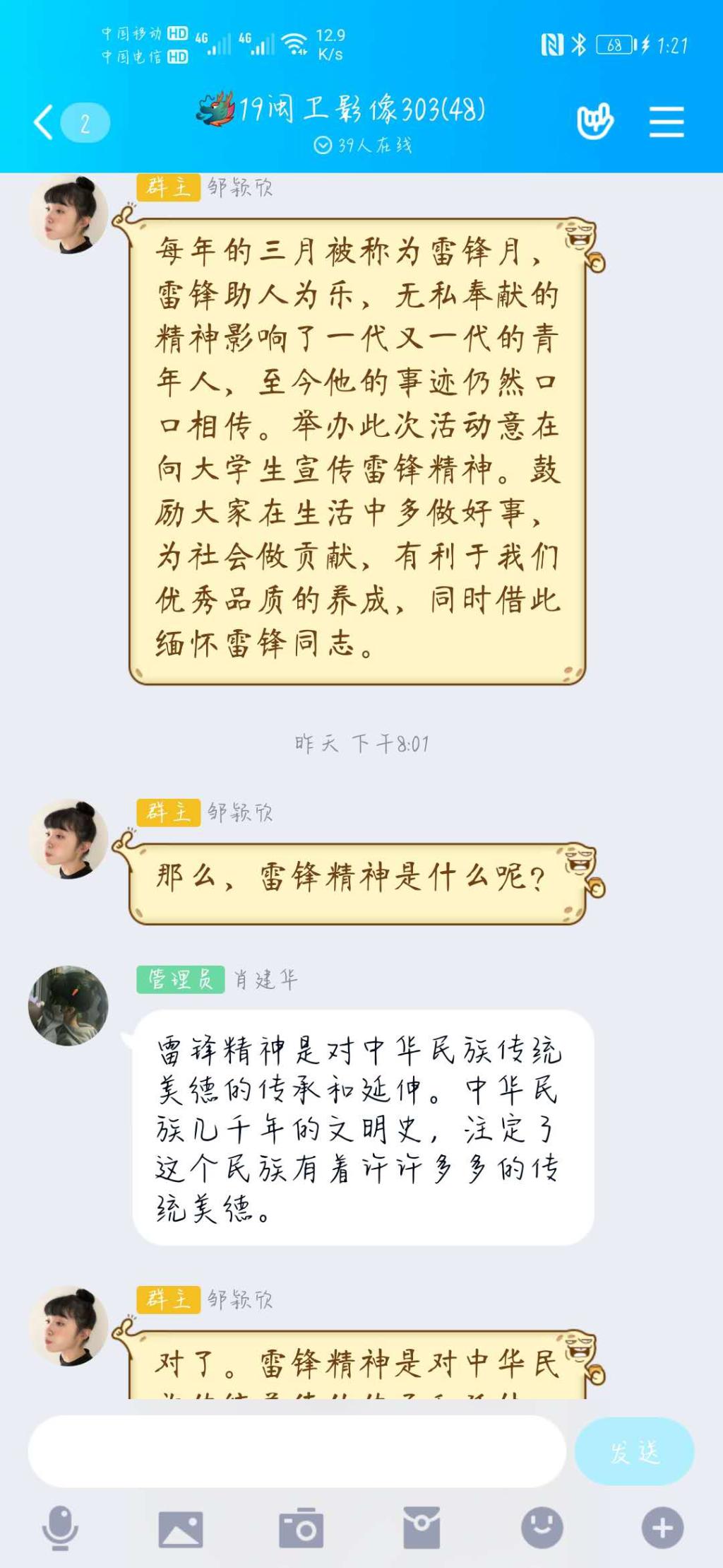 2020年3月5日,中國(guó)迎來了第57個(gè)雷鋒日,同時(shí)也是第21個(gè)中國(guó)青年志愿者服務(wù)日。我系團(tuán)總支于3月3日組織各級(jí)團(tuán)支部以“學(xué)雷鋒精神,念時(shí)代楷?!睘橹黝}在線上開展特別團(tuán)日活動(dòng)。此次活動(dòng)的舉辦,讓我們看到學(xué)生的傳承精神、愛國(guó)精神、集體主義精神,更有濃濃的祝福。