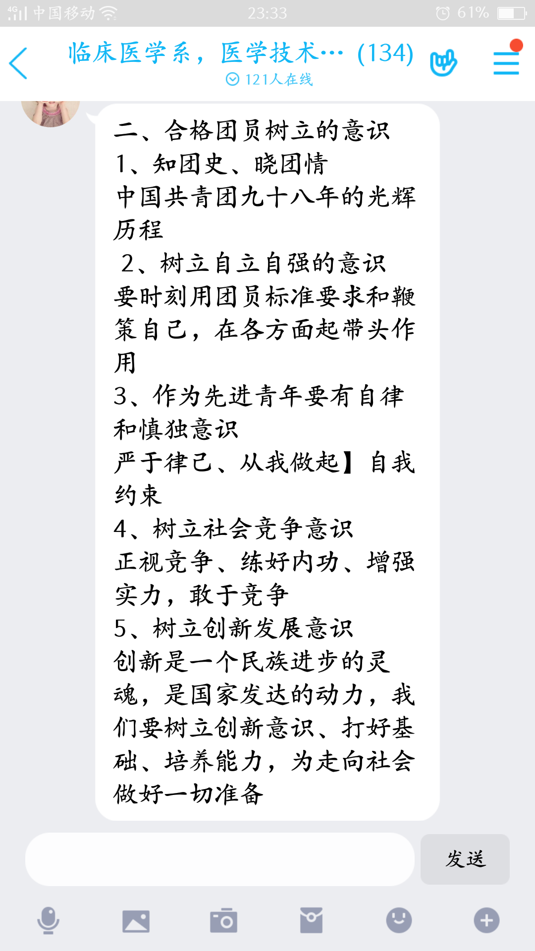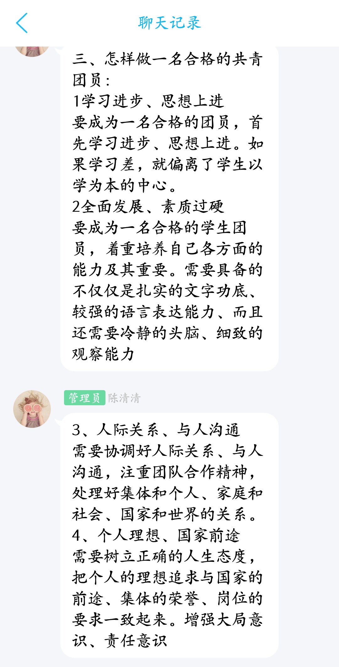 首先,陳清清老師帶領(lǐng)同學(xué)們認(rèn)識共青團(tuán),她表示作為一名光榮的團(tuán)員,應(yīng)該嚴(yán)于律己,不斷的增強(qiáng)個人團(tuán)員意識,用實(shí)際行動展現(xiàn)當(dāng)代青年的時代性與先進(jìn)性,絕不能讓胸前的團(tuán)徽褪色。進(jìn)而從樹立知團(tuán)史曉團(tuán)情意識、自立自強(qiáng)意識、自律慎獨(dú)意識、社會競爭意識、創(chuàng)新發(fā)展意識五個方面講述做一名合格團(tuán)員所應(yīng)該樹立的意識。
