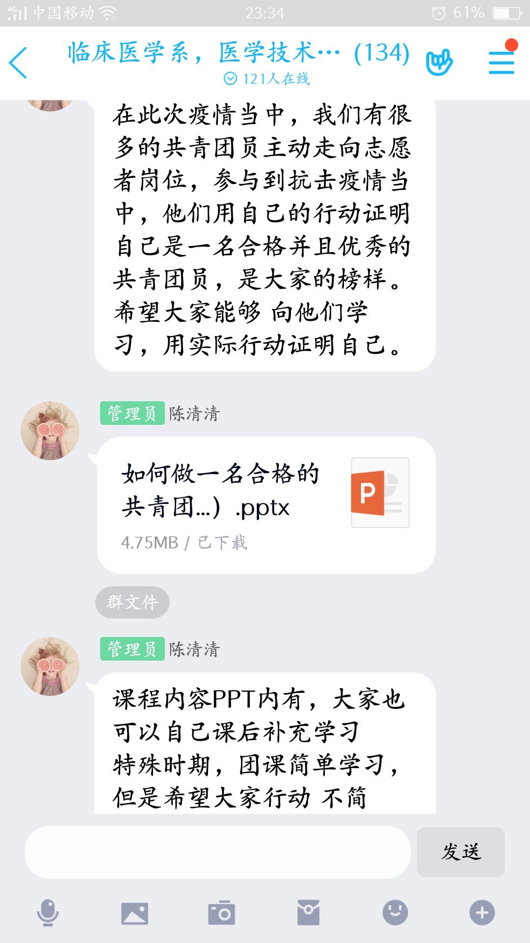 2020年3月12日晚上,醫(yī)學(xué)技術(shù)系、臨床醫(yī)學(xué)系通過QQ平臺進(jìn)行線上“醫(yī)學(xué)技術(shù)系第十期、臨床醫(yī)學(xué)系第十一期業(yè)余分團(tuán)?!钡谌n。臨床醫(yī)學(xué)系團(tuán)總支書記陳清清老師以“如何做一名合格的共青團(tuán)員”為主題進(jìn)行授課。此次團(tuán)課圍繞“對共青團(tuán)的認(rèn)識”、“做一名合格團(tuán)員應(yīng)該樹立的意識”、“怎樣做一名合格的共青團(tuán)員”三個部分展開。