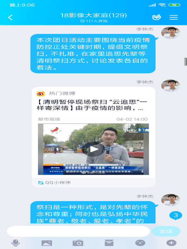 在全國上下眾志成城、堅決打贏疫情防控人民阻擊戰(zhàn)之際,為銘記革命先烈,緬懷為戰(zhàn)“疫”而犧牲的最美“逆行”者,傳承中華民族傳統(tǒng)文化,踐行社會主義核心價值觀,我系各班團支部于3月31日以QQ直播等方式開展以“網(wǎng)上祭英烈,防疫思英雄”為主題的團日活動,倡導(dǎo)同學(xué)們響應(yīng)國家號召,開展“云”祭掃,做到“足不出戶”瞻仰英雄烈士。