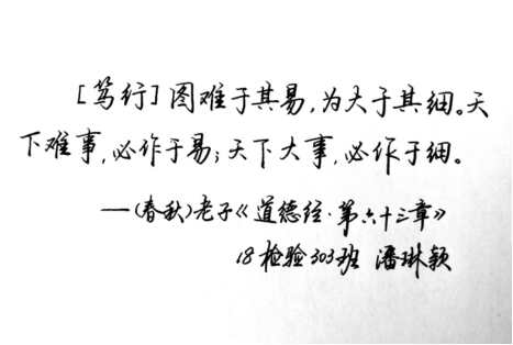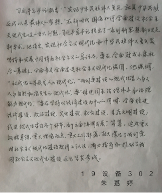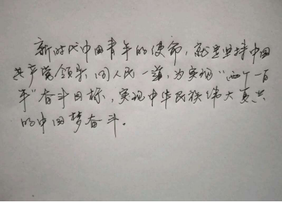 活動采取了軟筆和硬筆兩種形式,我系學(xué)生積極踴躍地參加,共收到七十余份作品。參賽作品都個性十足,抬手提筆,盡其所能地展示自身書法才能,或蒼勁有力、或飄逸清秀,一筆一劃間都彰顯著漢字的獨特魅力,充滿了對習(xí)近平新時代中國特色社會主義思想的歌頌與弘揚。經(jīng)系部嚴格篩選、反復(fù)斟酌,選出軟筆和硬筆各五幅優(yōu)秀作品,進行展示。