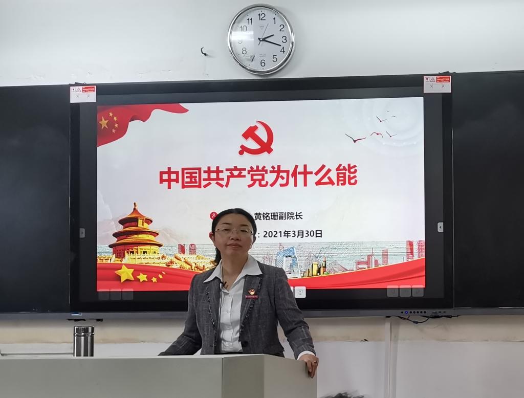 為進(jìn)一步引領(lǐng)學(xué)生更好了解中國共產(chǎn)黨為中國人民謀幸福,為中華民族謀復(fù)興的偉大實踐,進(jìn)一步堅定理想信念,厚植家國情懷,2021年3月30日,學(xué)校黨委委員、副院長黃銘珊在教學(xué)樓103為醫(yī)學(xué)技術(shù)系學(xué)子講授以《中國共產(chǎn)黨為什么能》為題的形勢與政策課。