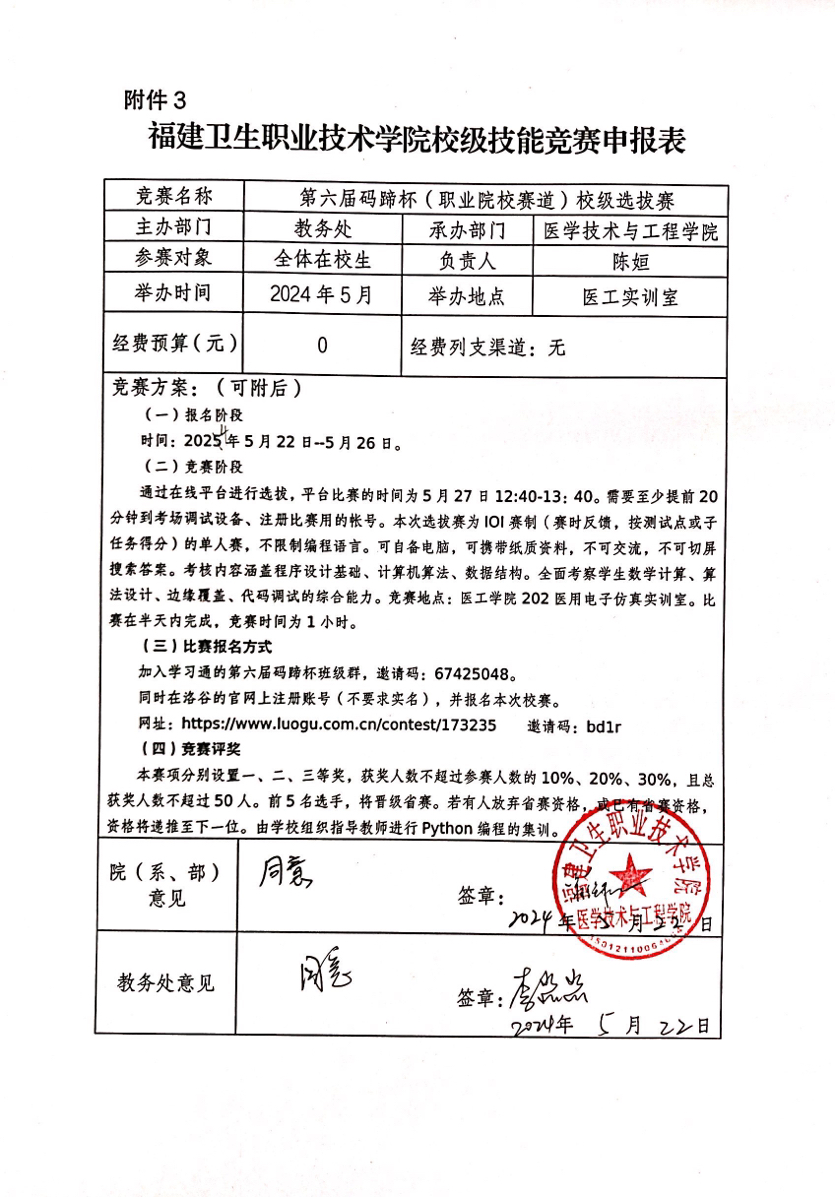 通過在線平臺(tái)進(jìn)行選拔,平臺(tái)比賽的時(shí)間為5月27日12:40-13:40。需要至少提前20分鐘到考場(chǎng)調(diào)試設(shè)備、注冊(cè)比賽用的帳號(hào)。本次選拔賽為IOI賽制(賽時(shí)反饋,按測(cè)試點(diǎn)或子任務(wù)得分)的單人賽,不限制編程語言。可自備電腦,可攜帶紙質(zhì)資料,不可交流,不可切屏搜索答案。考核內(nèi)容涵蓋程序設(shè)計(jì)基礎(chǔ)、計(jì)算機(jī)算法、數(shù)據(jù)結(jié)構(gòu)。全面考察學(xué)生數(shù)學(xué)計(jì)算、算法設(shè)計(jì)、邊緣覆蓋、代碼調(diào)試的綜合能力。競(jìng)賽地點(diǎn):醫(yī)工學(xué)院202醫(yī)用電子仿真實(shí)訓(xùn)室。比賽在半天內(nèi)完成,競(jìng)賽時(shí)間為1小時(shí)。