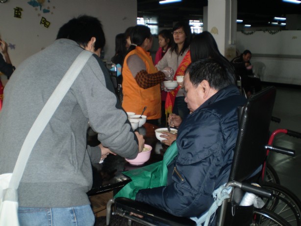 活動(dòng)當(dāng)天,大家首先給老人們送上滿載祝福的拗九粥。劉利根等同學(xué)一邊陪老人聊天拉家常,聽老人講他們當(dāng)年艱苦的生活,一邊向院領(lǐng)導(dǎo)詢問了老人在老年院的生活狀況。同學(xué)們有的給老人們喂水果,有的攙扶著雙腿不便的老人,幫助他們進(jìn)行康復(fù)鍛煉。中午同學(xué)們準(zhǔn)備了豐盛的午餐,并親手喂到行動(dòng)不便的老人口中。一天的活動(dòng),老人們歡聲不斷,笑語連綿,充滿著祥合的氣氛。