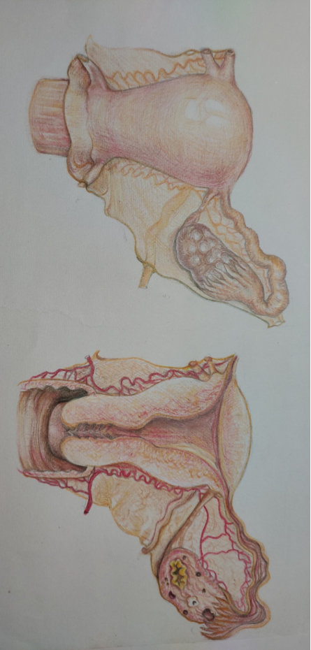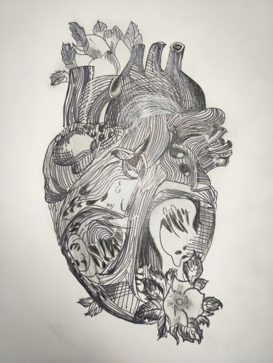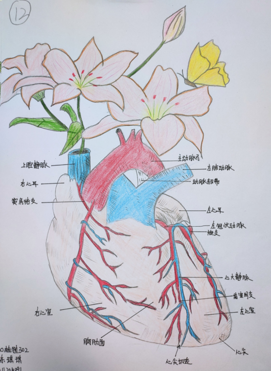 關(guān)于心臟 ,在繪畫中 可以清晰的了解到心臟的內(nèi)部結(jié)構(gòu) ,并且在心臟的上腔靜脈處畫上了一朵花 給予心花怒放的生命意義 并不只僅僅于臟器解剖的美 想要賦予美學(xué)與醫(yī)學(xué)的結(jié)合。