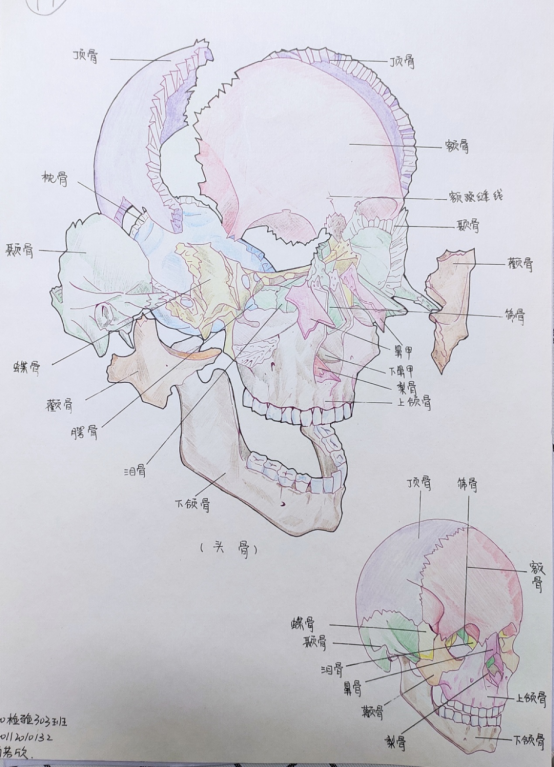 千人千面,喜怒哀樂,都可以通過一個(gè)只占人體1/7的頭部表達(dá)。顱骨共23塊。分為腦顱與面顱,另外有3對(duì)聽小骨位于顳骨內(nèi)。腦顱位后上方,略呈卵圓形,內(nèi)為顱腔,容納腦。面位于前下方,形成面部的基本輪廓,并參與構(gòu)成眼眶、鼻腔和口腔。畫這張顱骨可以讓同學(xué)們更好的了解頭部結(jié)構(gòu)。