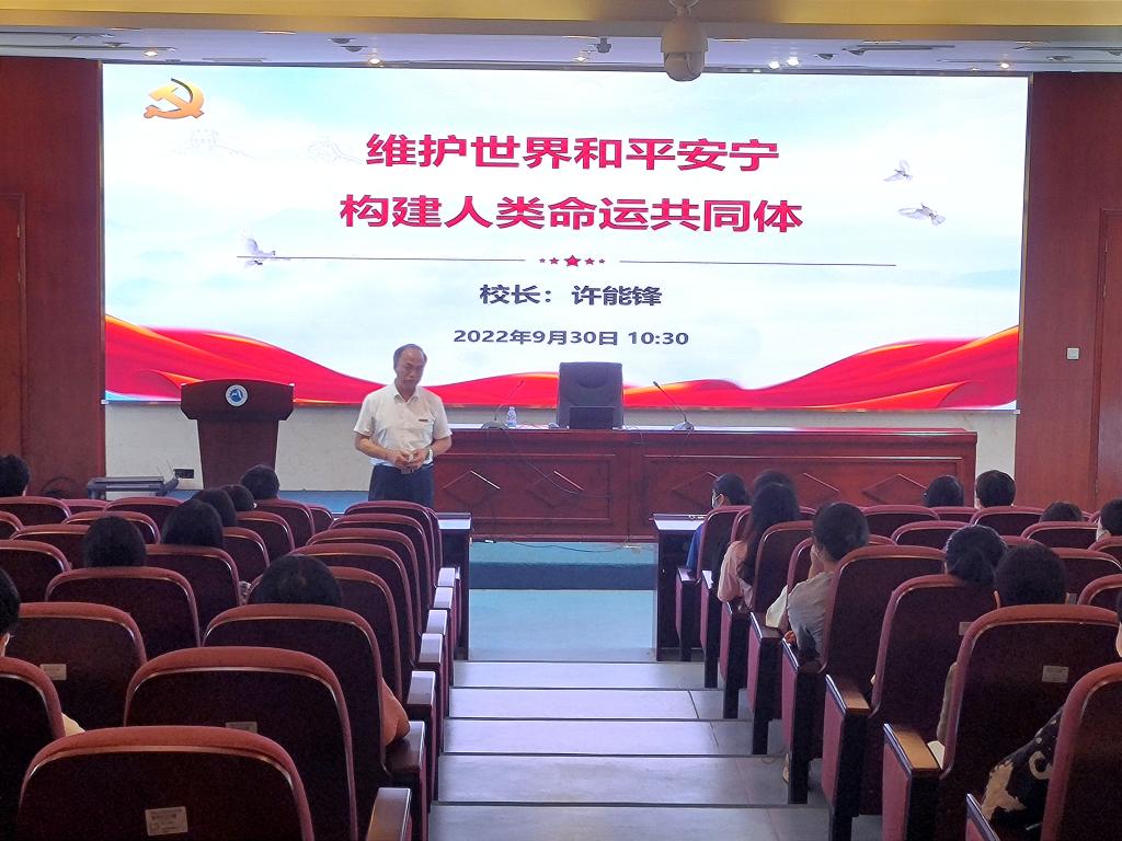 9月30日,校長許能鋒以《維護世界和平安寧  構建人類命運共同體》為題,為醫(yī)學技術系21影像(高本貫通)501和22眼視光302班學生講授形勢與政策課。