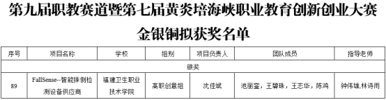 2023年7月31日至8月1日,第九屆福建省“互聯(lián)網(wǎng)+”大學(xué)生創(chuàng)新創(chuàng)業(yè)大賽職教賽道暨第七屆黃炎培海峽職業(yè)教育創(chuàng)新創(chuàng)業(yè)大賽在黎明職業(yè)大學(xué)舉行。我校報送的參賽項目《FallSense--智能摔倒檢測設(shè)備供應(yīng)商》在省賽網(wǎng)評中勝出,參加本次現(xiàn)場決賽并獲得銀獎。