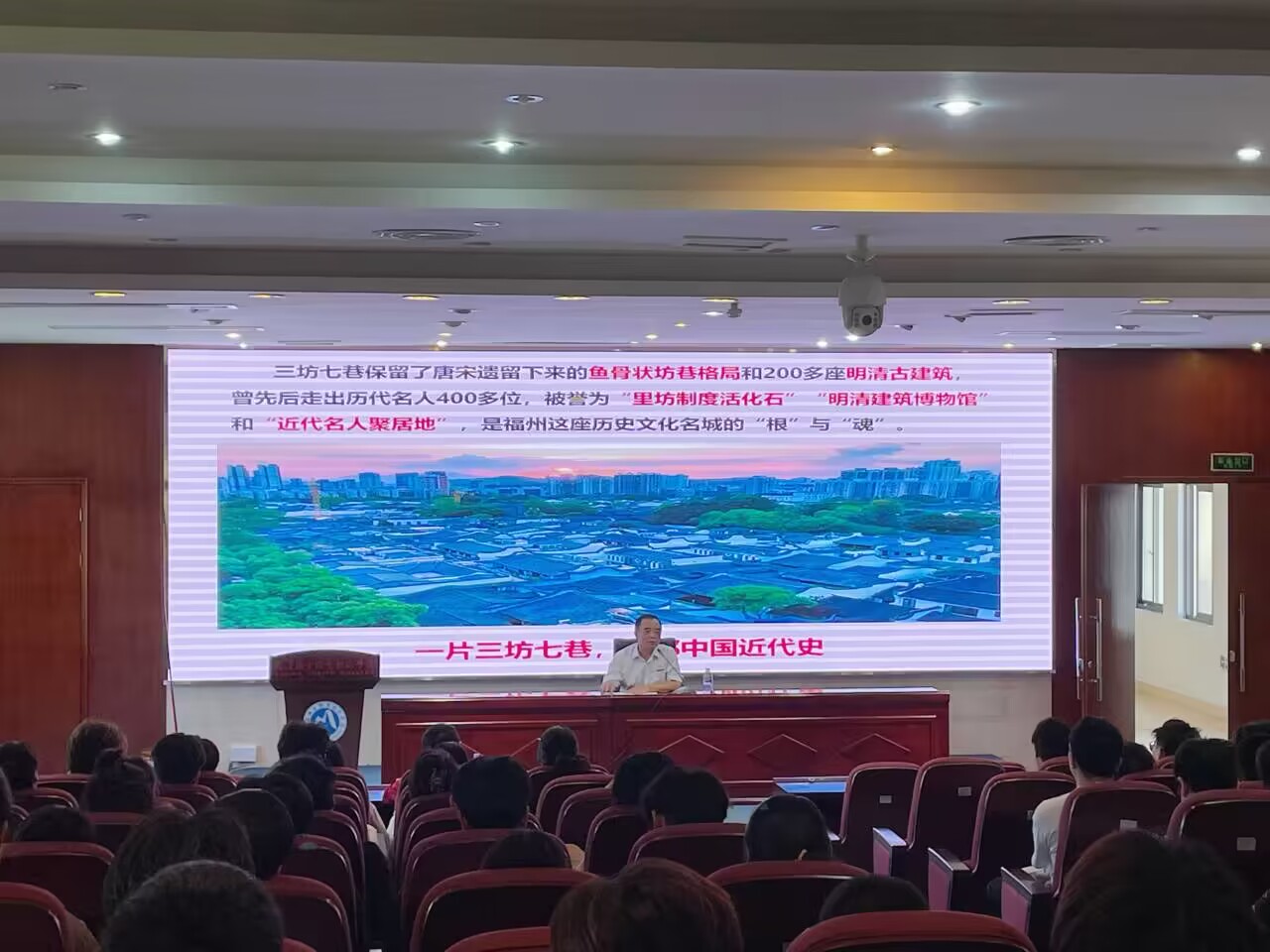 課堂上,游鋒還為同學(xué)們擔(dān)任起福州三坊七巷、曇石山遺址博物館的臨時(shí)導(dǎo)游,引導(dǎo)同學(xué)們走入其中、放慢腳步、認(rèn)真品味其獨(dú)特的文化底蘊(yùn)。他還為同學(xué)們解讀校風(fēng)學(xué)風(fēng),勉勵(lì)同學(xué)們要傳承和堅(jiān)守中華優(yōu)秀傳統(tǒng)文化,崇健、臻善、仁愛、愛國,擔(dān)負(fù)起屬于新青年的時(shí)代使命。