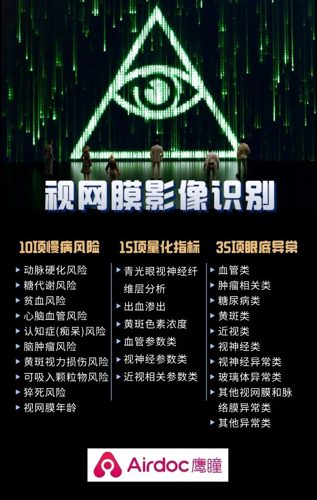 僅需30秒到1分鐘,一張張眼底視網(wǎng)膜照片,就從一臺白色的便攜式眼底相機傳送至AI人工智能云平臺。通過視網(wǎng)膜影像識別,鷹瞳Airdoc創(chuàng)新AI慢病風(fēng)險評估與眼底疾病診斷技術(shù),即可逐一為受檢者詳細分析10項健康風(fēng)險評估+15項量化指標(biāo)+35項眼底異常。