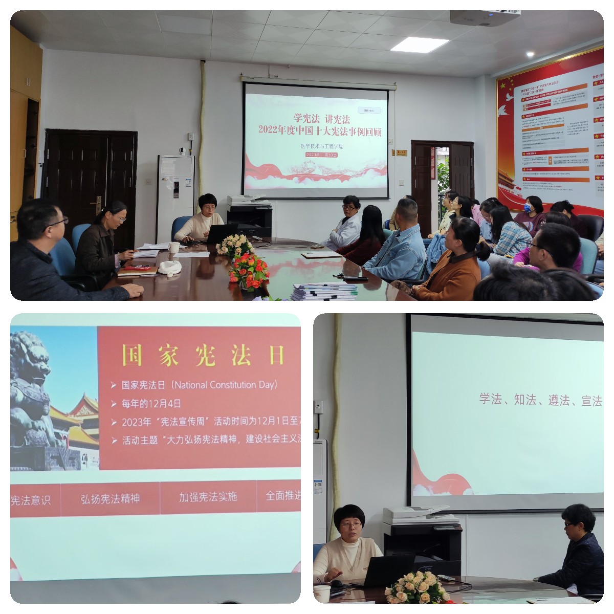 會(huì)上,學(xué)院黨總支書(shū)記柯瓊鶯以《學(xué)憲法 講憲法 2022年度中國(guó)十大憲法事例回顧》為題,為教職工開(kāi)展憲法教育。她強(qiáng)調(diào)今年12月4日是第十個(gè)國(guó)家憲法日,學(xué)院教職工要增強(qiáng)憲法意識(shí),帶頭學(xué)法、知法、尊法、宣法,結(jié)合課程思政、主題班會(huì)等弘揚(yáng)好憲法精神。