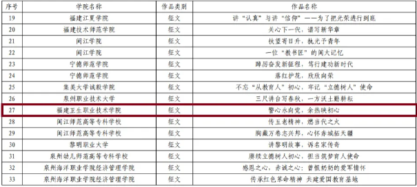 近日,福建省教育廳關(guān)工委通報(bào)2023年“讀懂中國”活動(dòng)作品評審結(jié)果,我校關(guān)工委獲全國優(yōu)秀組織獎(jiǎng),我院選送的《警心永向黨,余熱映初心》獲評全省最佳征文作品,《捧出一顆丹心,獻(xiàn)與億兆生靈》、《勞模精神不褪色,鼓蕩丹心永綿延》獲評全省優(yōu)秀征文作品。