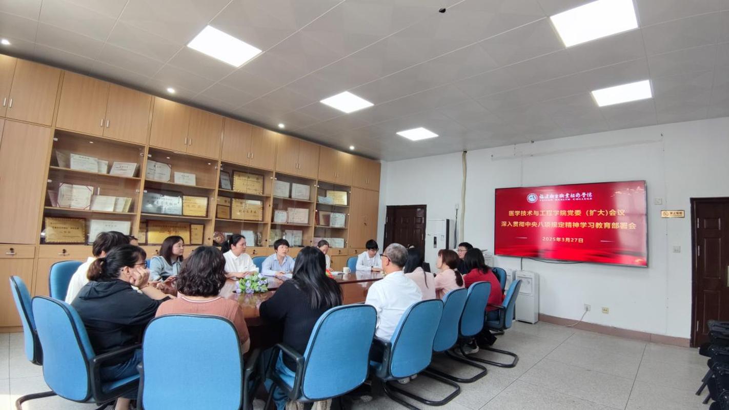 3月27日,醫(yī)學技術(shù)與工程學院召開黨委(擴大)會議,研究部署深入貫徹中央八項規(guī)定精神學習教育工作。學院黨委委員、黨支部委員參加會議,學院黨委書記柯瓊鶯主持會議。
