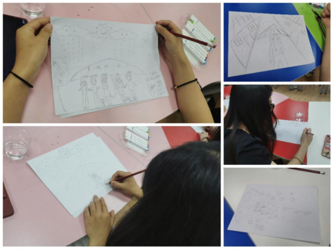 在“雨中人”主題繪畫環(huán)節(jié),同學們在白紙上根據要求自由發(fā)揮,并涂上顏色。隨后雪梅老師一一為大家解讀了畫的寓意,如雨滴的大小代表壓力的大小,傘、屋檐等保護物其實就是自己感知到的面對壓力的支持力量,她還就畫的布局分析了同學們的性格和處事方式。