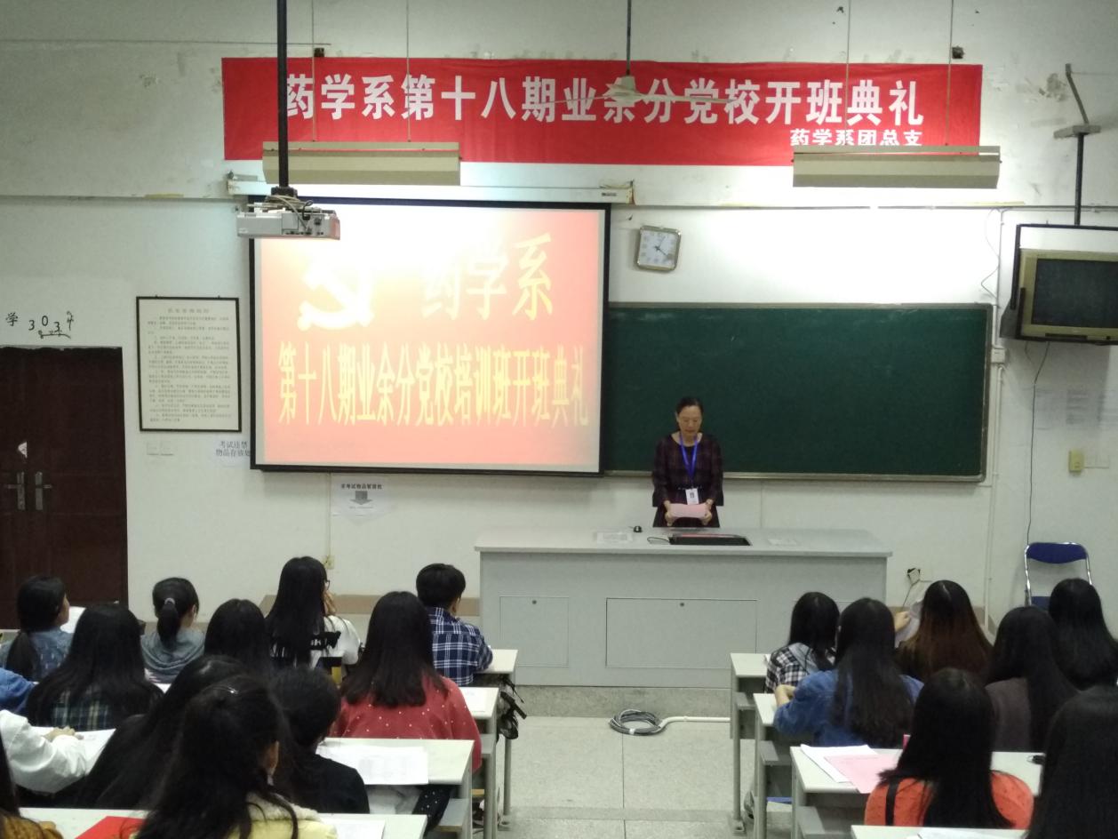 2016年11月8日,藥學(xué)系第十八期業(yè)余分黨校開班典禮在藥二階隆重舉行,蒞臨本次大會(huì)的系領(lǐng)導(dǎo)老師有:藥學(xué)系黨總支蘇愛華書記、林燕副書記、藥學(xué)系第一黨支部書記葉雅沁老師、藥學(xué)系第二黨支部書記何舒瀾老師、學(xué)生黨支部書記陳瑜老師以及藥學(xué)系團(tuán)總支書記李寶珠老師和團(tuán)副書記黃嵩梅老師。