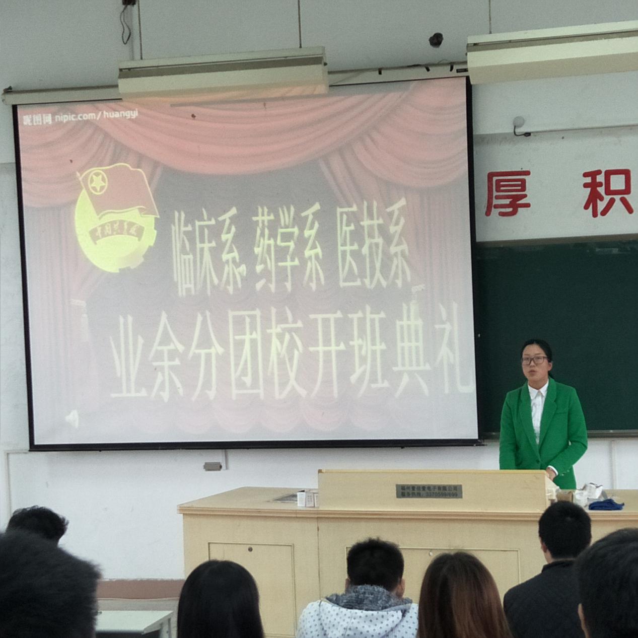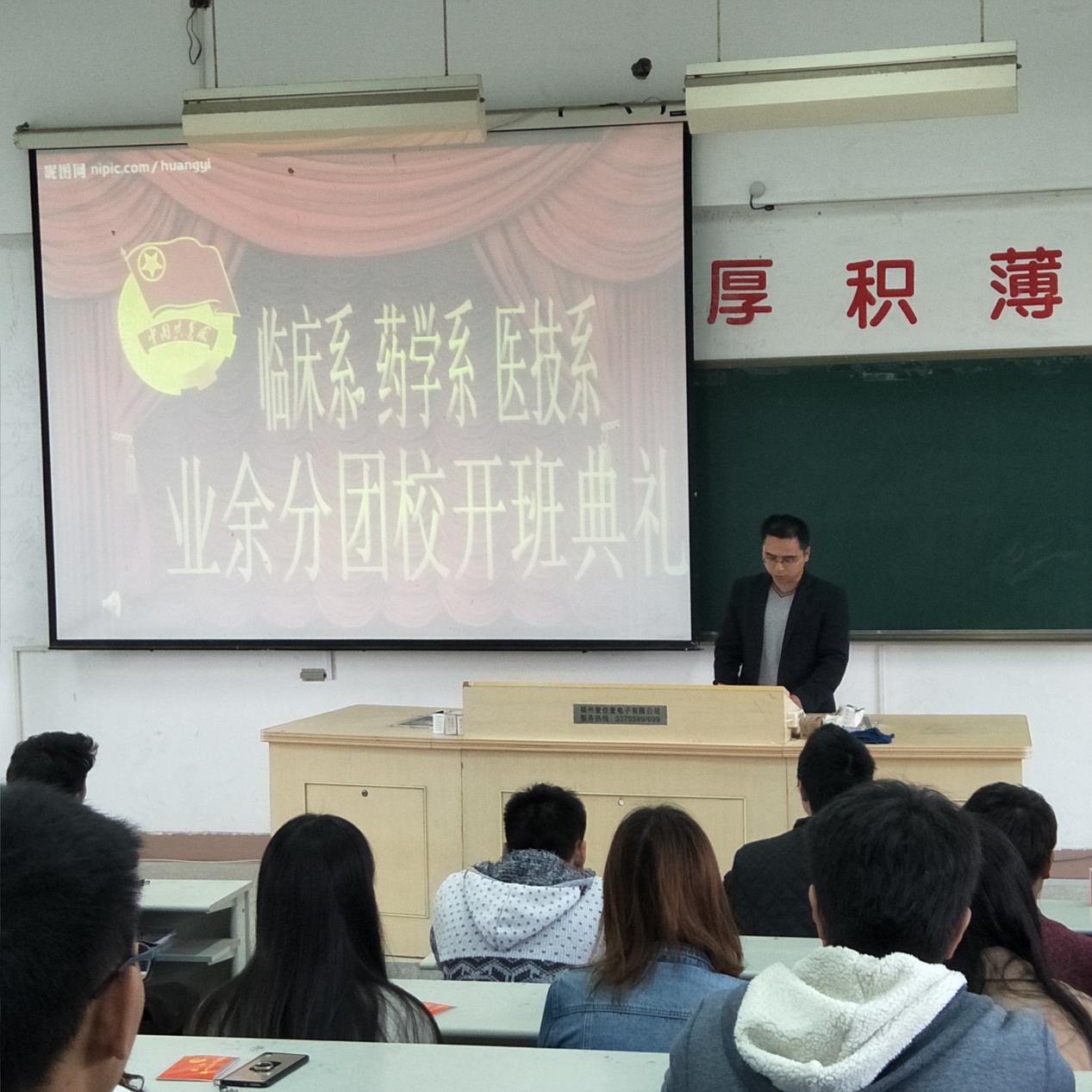 ,由藥學(xué)系、臨床系、醫(yī)技系共同舉辦的業(yè)余分團(tuán)?;顒釉谂R床系二階舉行開班典禮。蒞臨本次大會的老師有:藥學(xué)系團(tuán)總支書記李寶珠老師、臨床醫(yī)學(xué)系團(tuán)總支書記葉家濤老師、醫(yī)學(xué)技術(shù)系團(tuán)總支書記楊盈老師、臨床系團(tuán)總支副書記陳清清老師、臨床醫(yī)學(xué)系黃惠龍老師。