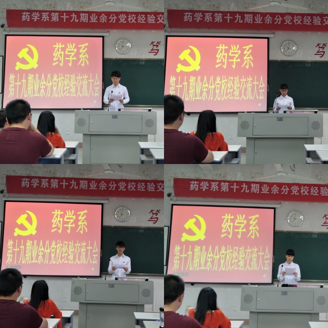 2017年6月15日,藥學(xué)系在藥一階隆重舉行第十九期業(yè)余分黨校心得交流大會。蒞臨本次大會的領(lǐng)導(dǎo)以及老師有:藥學(xué)系黨總支書記鄭力宏老師、藥學(xué)系黨總支副書記陳潔老師、藥學(xué)系團總支書記黃嵩梅老師,以及輔導(dǎo)員陳翰老師和高施老師。